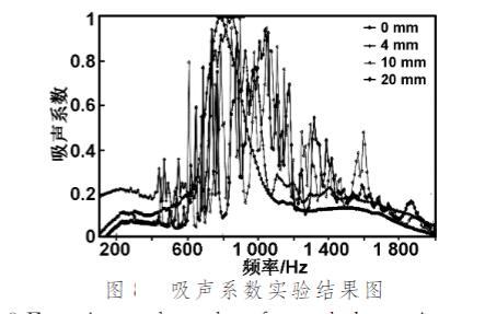 使用10mm后腔,半徑30mm的彈性薄膜分別施加0 mm,4 mm,10 mm,20 mm的拉伸(以改變表面張力),并在薄膜中心粘結直徑5mm、厚度2mm的質量塊。測量吸聲系數。