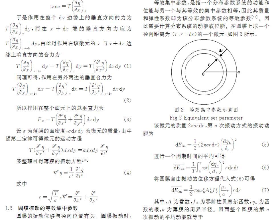 分析薄膜振動需進行受力分析。薄膜所受內力僅為張力。設單位長度薄膜張力為T(N/m),單位面積質量為ρ。取薄膜平衡位置在xy平面內的微元體分析(圖1),當其受到垂直xy面的外力擾動后,會在張力T作用下產生橫向振動,恢復力主要為張力。