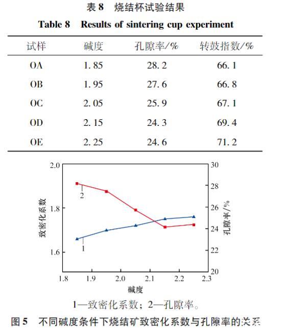 從表9可以看出,在堿度為1.85~2.15范圍內(nèi),隨著堿度的提高,燒結(jié)礦的孔隙率呈不斷降低趨勢,其轉(zhuǎn)鼓指數(shù)不斷增大,燒結(jié)礦強(qiáng)度增大。當(dāng)堿度達(dá)到2.25時(shí),相比前一堿度2.15,孔隙率略有增加,轉(zhuǎn)鼓指數(shù)稍有下降。原因可能是當(dāng)堿度逐漸提高超過一定值(>2.15),燒結(jié)礦內(nèi)逐漸產(chǎn)生更多硅酸二鈣晶型轉(zhuǎn)變引起的氣孔與微裂紋,透氣性反而略有提高,孔隙率反彈微升。