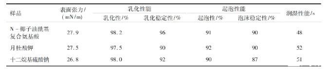 以大豆為原料合成的N-椰子油酰基復(fù)合氨基酸表面活性劑表面張力、乳化起泡潤濕性能測定(二)