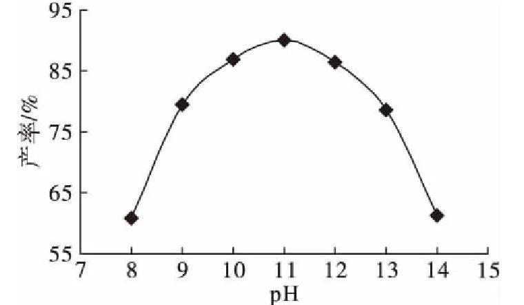 由圖2可以看出,pH影響產(chǎn)率的總體趨勢是首先逐步提高,達(dá)到最大值后逐步下降,pH為11時(shí)產(chǎn)物產(chǎn)率最大。因此,選擇pH 10~12進(jìn)行優(yōu)化試驗(yàn)。