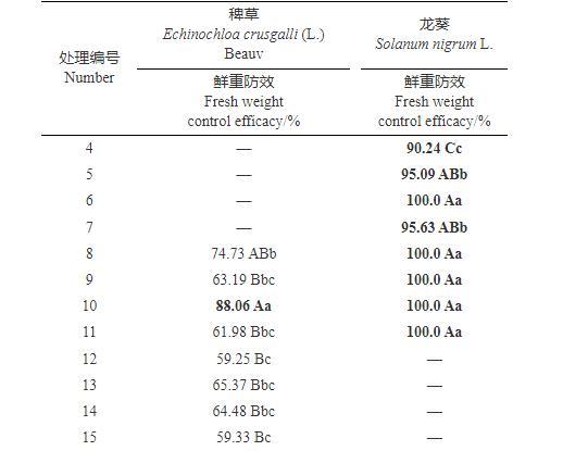 由表5數(shù)據(jù)可以看出,處理4~7對(duì)龍葵鮮重防效均在90%以上,其中最好的是添加了2#增效劑的處理6,鮮重防效為100%,其次是添加了1#增效劑的處理5和添加了3#增效劑的處理7,最差的是未添加增效劑的處理4,處理5~6與處理4差異顯著,處理6與處理5、7在0.05水平上差異顯著。處理8~11對(duì)龍葵效果均較佳,鮮重防效均為100%;對(duì)稗草防治效果最好的是添加了2#增效劑的處理10,鮮重防效為88.06%,其他處理防效略差,鮮重防效在61%~74%之間,處理10與處理8、9、11在0.05水平上差異顯著。處理12~15對(duì)稗草的防治效果均一般,鮮重防效在59%~65%之間。