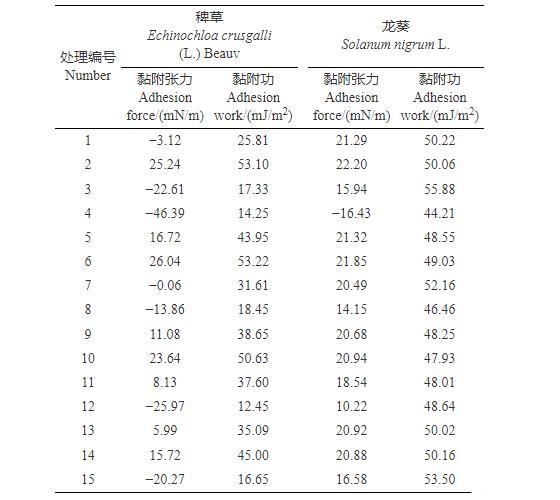 表4 15種處理作用于靶標(biāo)作物時(shí)的黏附張力和黏附功