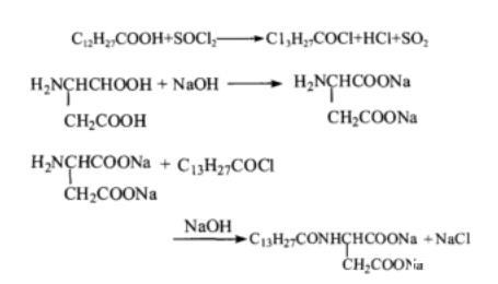 先合成十四酰氯和天冬氨酸鈉,然后再將十四酰氯與天冬氨酸鈉反應(yīng)得到目標(biāo)產(chǎn)物N-十四?;於彼徕c。