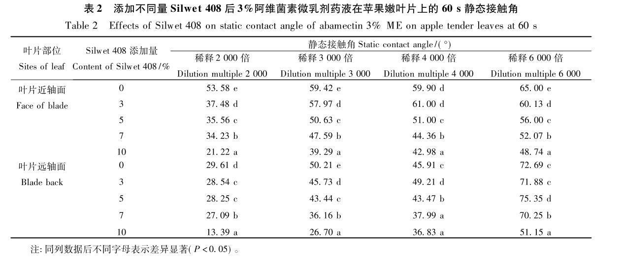 2.2添加不同量Silwet 408對(duì)阿維菌素微乳劑藥液在蘋(píng)果嫩葉片上靜態(tài)接觸角的影響