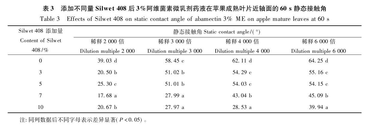 2.3添加不同量Silwet408對(duì)阿維菌素微乳劑藥液在蘋(píng)果成熟葉片上靜態(tài)接觸角的影響