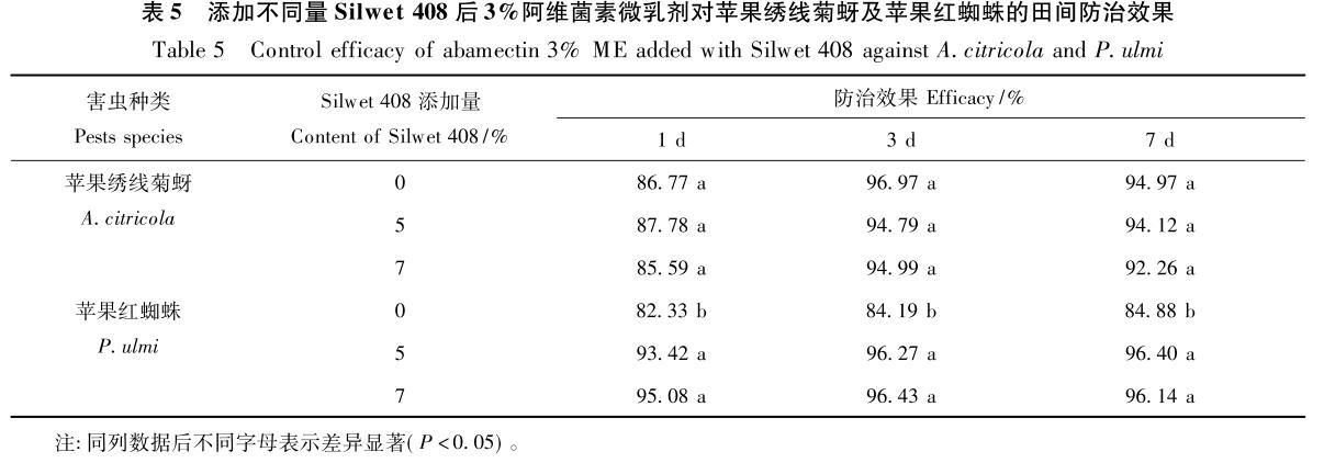 綜合表面張力、接觸角及室內(nèi)毒力測(cè)定結(jié)果,選擇Silwet408添加量分別為5%和7%的阿維菌素微乳劑藥液進(jìn)行了田間防效試驗(yàn)。結(jié)果(表5)與室內(nèi)毒力試驗(yàn)結(jié)果規(guī)律基本一致:添加Silwet408對(duì)提高阿維菌素微乳劑對(duì)蘋(píng)果紅蜘蛛田間防治效果作用顯著,而對(duì)蘋(píng)果繡線(xiàn)菊蚜防效的影響則不明顯,再次證明Silwet408雖可有效降低阿維菌素微乳劑的表面張力和接觸角,但卻未必一定能提高其對(duì)不同害蟲(chóng)的防效。