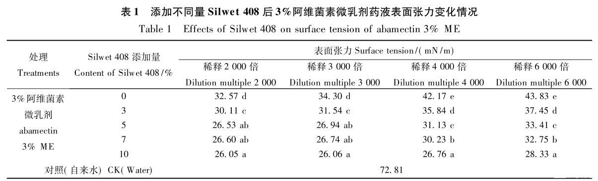 結(jié)果見(jiàn)表1。在質(zhì)量分?jǐn)?shù)3%~10%范圍內(nèi),隨著Silwet 408添加量的增加,3%阿維菌素微乳劑藥液的表面張力不斷減小;同時(shí)隨著藥液稀釋倍數(shù)增大,其表面張力逐漸增大。當(dāng)藥液稀釋至2 000~3 000倍時(shí),添加3%~10%Silwet 408后其表面張力顯著低于未添加助劑的藥液,且5%~10%助劑添加量之間差異不顯著;當(dāng)稀釋至4000~6000倍時(shí),則不同Silwet 408添加量之間差異顯著。表明添加Silwet 408可顯著降低阿維菌素微乳劑的表面張力,可能有利于促進(jìn)藥液在靶標(biāo)上的潤(rùn)濕。