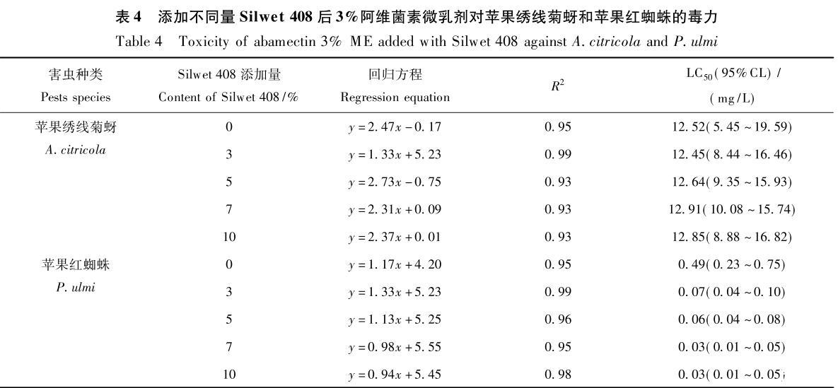 從表4中數(shù)據(jù)可看出:添加Silwet408可明顯提高阿維菌素微乳劑對(duì)蘋(píng)果紅蜘蛛的毒力,且隨助劑添加量的增加,藥劑LC50值降低;但添加Silwet408對(duì)阿維菌素微乳劑對(duì)蘋(píng)果繡線(xiàn)菊蚜的毒力并無(wú)明顯影響。說(shuō)明Silwet408雖能降低藥液的表面張力及在靶標(biāo)葉面的接觸角,促進(jìn)藥液在葉片上的潤(rùn)濕性,但并不一定能提高其對(duì)害蟲(chóng)的毒力。