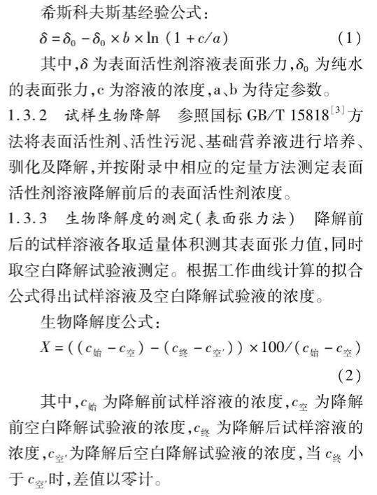 表面張力隨著表面活性劑的濃度變化而變化是表面活性劑的特性,利用該特性可以解決諸多問(wèn)題。隨著表面活性劑的不斷研發(fā)探索,多種新型表面活性劑相繼上市,其中部分表面活性劑因具有獨(dú)特的分子結(jié)構(gòu)導(dǎo)致無(wú)法用傳統(tǒng)的試驗(yàn)方法測(cè)定其生物降解度。嘗試用表面張力法解決該問(wèn)題,并與標(biāo)準(zhǔn)規(guī)定的方法做對(duì)比,分析該方法的可行性。