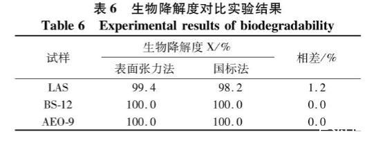 對(duì)比兩種方法得出的生物降解度,由表6可知,表面張力法計(jì)算得出的生物降解度比國標(biāo)法測定的結(jié)果偏高或者一致,兩者相差小于2%,可認(rèn)為兩種方法均可測定表面活性劑的生物降解度,其結(jié)果均可信。