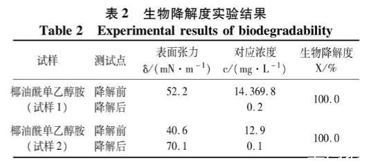 不同批次的椰油酰單乙醇胺試樣經(jīng)過降解后利用表面張力法測定其降解液的表面張力值,根據(jù)生物降解度公式計(jì)算得出降解度,測定結(jié)果見表2。其中空白降解試驗(yàn)液降解前與降解后的表面張力值分別是69.5、68.2mN/m,而試樣溶液在降解后測定的表面張力值均大于空白降解試驗(yàn)液降解后的表面張力值68.2mN/m,導(dǎo)致帶人工作曲線計(jì)算出的降解后試樣溶液的濃度(c終)小于降解后空白降解試驗(yàn)液的濃度(c空),根據(jù)公式要求,當(dāng)c終小于C空時(shí),差值以零計(jì),因此最終計(jì)算出的生物降解度為100.0%。