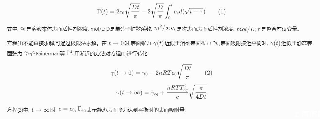 表面活性劑是一種能夠在界面吸附,降低界面張力的物質(zhì)。在界面快速形成過(guò)程中,如紡織品、紙和其他基質(zhì)的快速潤(rùn)濕,液體的發(fā)泡,用靜態(tài)(平衡)表面張力不能全面表征表面活性劑快速降低界面張力的能力,而動(dòng)態(tài)表面張力能更好地表征表面活性劑在上述過(guò)程中所起的作用。1946年Word和Tordai研究陰離子表面活性劑的界面吸附行為,提出了描述氣/液界面吸附量隨吸附時(shí)間變化的Word-Tordai方程;隨著各種檢測(cè)手段的開(kāi)發(fā)應(yīng)用,20世紀(jì)90年代起,關(guān)于表面活性劑的動(dòng)態(tài)表面張力及其在氣/液界面吸附行為又引起該領(lǐng)域研究者的關(guān)注。Eastoe和Dalton通過(guò)研究雙子型非離子表面活性劑在空氣——水界面的吸附機(jī)理,驗(yàn)證了Word和Tordai提出的擴(kuò)散控制吸附和混合動(dòng)力控制吸附模型適用于該體系。柴金玲等利用Word-Tordai方程得到烷基聚葡糖苷(APG)在不同濃度、溫度時(shí)的擴(kuò)散系數(shù)和表觀擴(kuò)散系數(shù),并發(fā)現(xiàn)鹽對(duì)吸附行為有明顯影響;劉杰等通過(guò)Rosen模型研究膠束對(duì)APG的動(dòng)態(tài)表面張力的影響,發(fā)現(xiàn)各項(xiàng)參數(shù)的變化趨勢(shì)不會(huì)因?yàn)槟z束的形成而受到影響。