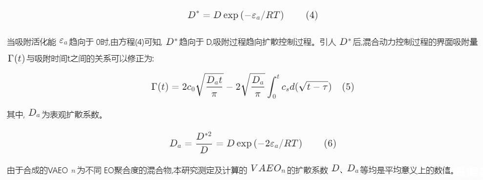 擴(kuò)散控制的吸附過(guò)程,表面活性劑分子由濃度差驅(qū)使進(jìn)入新表面,不存在吸附勢(shì)壘。Word-Tordai方程描述了界面吸附量Г(t)與吸附時(shí)間t的關(guān)系:Г(t)=2c0Dtπ-2Dπ∫t0csd(t-τ)(1)式中,c0是溶液本體表面活性劑濃度,mol/L,D是單分子擴(kuò)散系數(shù),m2/s,cs是次表面表面活性劑濃度,mol/L,τ是整合虛設(shè)變量。方程(1)不能直接求解,可通過(guò)極限法求解。在t→0時(shí),表面張力γ(t)近似于溶劑表面張力γ0,表面吸附接近平衡時(shí),γ(t)近似于靜態(tài)表面張力γeq.Fainerman等用漸近的方法對(duì)方程(1)進(jìn)行轉(zhuǎn)化:γ(t→0)=γ0-2nRTc0Dtπ(2)γ(t→∞)=γeq+nRTГ2eqcπ4Dt(3)方程(3)中,t→∞時(shí),c=c0,Γeq表示靜態(tài)表面張力達(dá)到平衡時(shí)的表面吸附量。混合動(dòng)力擴(kuò)散吸附是指表面活性劑分子從本體擴(kuò)散到次表面仍然遵循擴(kuò)散機(jī)理,但從次表面層擴(kuò)散到表面層時(shí)需克服一定的勢(shì)壘。Liggieri和Ravera[15,16]提出,次表面層中的分子,只有能量大于吸附活化能εa才能被吸附到表面,已吸附的分子,只有能量大于解吸活化能εb才能被解吸。以Word-Tordai方程為基礎(chǔ),引入矯正擴(kuò)散系數(shù)D?。矯正擴(kuò)散系數(shù)D?和擴(kuò)散系數(shù)D關(guān)系定義為:D?=Dexp(——εa/RT)(4)當(dāng)吸附活化能εa趨向于0時(shí),由方程(4)可知,D?趨向于D,吸附過(guò)程趨向擴(kuò)散控制過(guò)程。引入D?后,混合動(dòng)力控制過(guò)程的界面吸附量Г(t)與吸附時(shí)間t之間的關(guān)系可以修正為:Г(t)=2c0Datπ-2Daπ∫t0csd(t-τ)(5)其中,Da為表觀擴(kuò)散系數(shù)。Da=D?2D=Dexp(——2εa/RT)(6)由于合成的VAEOn為不同EO聚合度的混合物,本研究測(cè)定及計(jì)算的VAEOn的擴(kuò)散系數(shù)D、Da等均是平均意義上的數(shù)值。