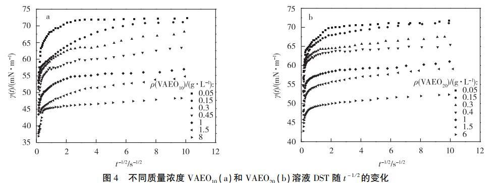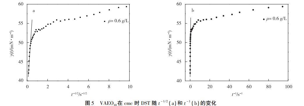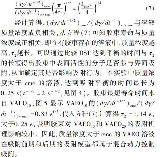 經(jīng)計算得,(dγ/dt-1/2)cmc/(dγ/dt-1)c>cmc與溶液質(zhì)量濃度成負相關(guān),從方程(7)可知膠束壽命與質(zhì)量濃度成正相關(guān),即在有膠束存在的溶液中,質(zhì)量濃度越高,τ2越長??梢酝ㄟ^比較DST達到平衡的時間與τ2的長短得出膠束中表面活性劑分子是否參與界面吸附,從而確定其是否影響吸附行為。本實驗中質(zhì)量濃度大于cmc的溶液,達到吸附平衡的時間最長為0.25s(t-1/2=2s-1/2,見圖4)。膠束最短壽命時間來自VAEO10,圖5顯示VAEO10的(dγ/dt-1/2)cmc/(dγ/dt-1)c≈cmc=0.83s1/2,代入方程(7)計算得τ2=1.14s,大于0.25s,表明膠束對VAEO10和VAEO20的吸附機理影響較小。因此,質(zhì)量濃度大于cmc的VAEO溶液在吸附前期和后期的吸附模型都屬于混合動力控制吸附。