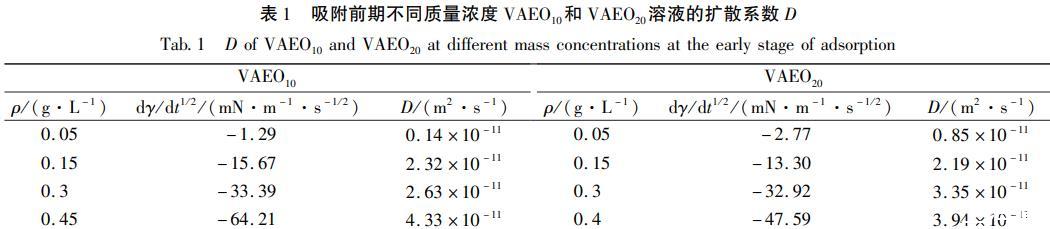 在初始吸附階段,表面層VAEO分子很少,可以用方程(2)來表述表面張力與時間的關(guān)系,對非離子表面活性劑,式中n=1.以y(t)對t/2作圖,結(jié)果見圖3.短時間內(nèi)γ(t)與t1/2成直線關(guān)系,直線截距對應溶劑的表面張力,擴散系數(shù)D可由直線斜率求出,結(jié)果見表1.
