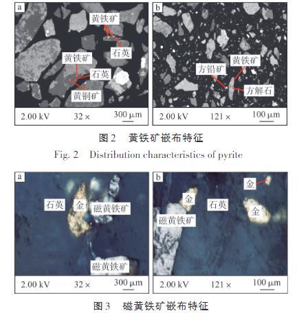 由圖3可知:磁黃鐵礦在礦石中主要以嵌布形式存在,主要嵌布于脈石礦物粒間,少量嵌布在脈石礦物裂隙中。嵌布于脈石礦物粒間的磁黃鐵礦粒度以大于0.037 mm為主,而嵌布在脈石礦物裂隙中的磁黃鐵礦多呈細脈狀構(gòu)造產(chǎn)出。常見金礦物與磁黃鐵礦連晶嵌布于脈石礦物粒間,這表明磁黃鐵礦與金礦物之間存在密切的關(guān)系,磁黃鐵礦同樣是主要載金礦物。