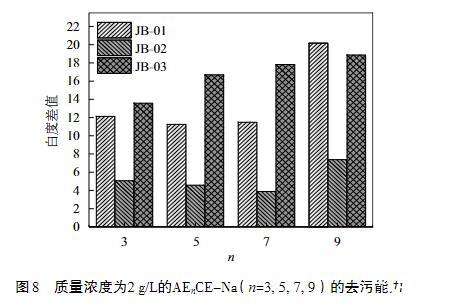 洗滌劑在生活和生產(chǎn)中都扮演著重要的角色,而表面活性劑是各種洗滌劑的主要成分。因此,測(cè)試了JB-01,JB-02及JB-03三種污布在不同EO加合數(shù)的表面活性劑溶液AEnCE-Na中洗滌前后的白度值,并將同一塊污布在洗滌前后的白度值作差,得到如圖8所示的結(jié)果。