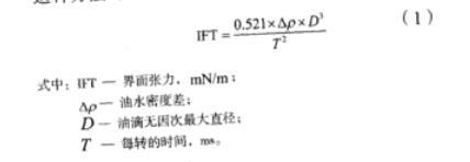 采用芬蘭Kibron dIFT雙通道動(dòng)態(tài)界面張力儀進(jìn)行界面張力測(cè)定。此張力儀的原理是:液滴通過旋轉(zhuǎn)處于一定的離心場(chǎng)中,這時(shí)兩種液體之間的界面張力及旋轉(zhuǎn)的速度就決定了液滴的形狀,液滴的平衡形狀通過調(diào)整轉(zhuǎn)速得到改變,而使液滴以一定的角速度自轉(zhuǎn),這時(shí)通過離心力、重力以及界面張力的三種力量的共同作用下,在高密度的液體中,低密度的液滴能夠形成圓柱形或長橢球形液滴。這種方法可以測(cè)定出10-6mN/m的超低界面張力。