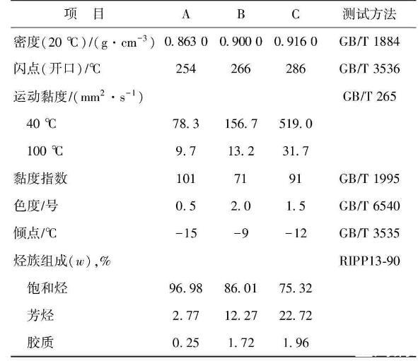 由圖2可以看出,加入復(fù)合劑后,基礎(chǔ)油的分水性變差,且不同基礎(chǔ)油的差異較大,其中基礎(chǔ)油A的水層最多,乳化層最少,分水性最好,基礎(chǔ)油B的分水性稍差,基礎(chǔ)油C的分水性最差。當(dāng)油相中混入少量水時(shí),形成WO乳化液。WO乳化液是由油、水和表面活性劑混合形成的。體系的形態(tài)是水以小液滴的形式分散于油中。水相是內(nèi)相或分散相,油是外相或連續(xù)相?;A(chǔ)油分水性由乳狀液的穩(wěn)定程度決定,WO乳化液的不穩(wěn)定形式主要是水相液珠的沉降、聚集和凝并。連續(xù)相的黏度越大,液珠沉降的速率越慢,油品越容易乳化,其分水性也越差。從基礎(chǔ)油族組成可以分析其分水性能的差異。