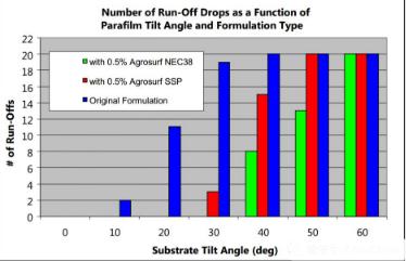 原始配方中超過(guò)一半以上的液滴在20°的傾斜角滾落,40°時(shí),全部液滴滾落。Agrosurf NEC38比Agrosurf SSP更有效,可防止所有液滴在30°時(shí)滾落,避免60%的液滴在40°滾落??蛻艨筛鶕?jù)這種方法,尋找更加優(yōu)異的表面活性劑。