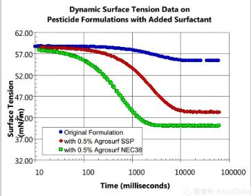我們分別用Kibron動(dòng)態(tài)表面張力儀,DSA100液滴形狀分析儀,從動(dòng)態(tài)表面張力,接觸角和滾動(dòng)角的角度,來(lái)全面衡量和評(píng)價(jià)0.5wt%的Agrosurf SSP、0.5wt%的Agrosurf NEC38對(duì)農(nóng)藥的噴灑效果。