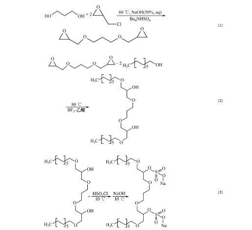 在三口燒瓶中加入1,3-丙二醇、環(huán)氧氯丙烷和四丁基硫酸氫銨,在40~50℃下攪拌。用恒壓滴液漏斗滴加質(zhì)量分數(shù)為50%NaOH水溶液,繼續(xù)在40~60℃攪拌2 h。用分液漏斗分出上層有機相,加入乙醇,熱過濾除去無機鹽,旋蒸除去乙醇和環(huán)氧氯丙烷,干燥得到環(huán)氧醚。在三口燒瓶中加入1-十二醇,BF3-乙醚溶液,攪拌片刻升溫至30~40℃,在攪拌條件下逐滴加入上步產(chǎn)物環(huán)氧醚,滴完后升溫至60~80℃,攪拌5 h,用分液漏斗分出上層有機相,旋蒸除去十二醇和環(huán)氧醚,干燥得到醇醚。在三口燒瓶中加入上步產(chǎn)物醇醚,攪拌,在10~20℃時非常緩慢地滴加氯磺酸,采用尾氣回收裝置除去氯化氫氣體,攪拌3 h,加入乙醇,熱過濾除去無機鹽,旋蒸除去乙醇,干燥得到最終產(chǎn)物起泡劑ULT-1。反應(yīng)原理如下列: