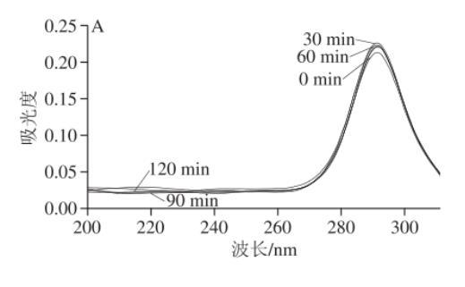 鹽酸胍誘導(dǎo)肌漿蛋白變性的熒光光譜如圖1A~C所示,3種肌漿蛋白都在290 nm波長(zhǎng)處達(dá)到最大吸光度,由于酪氨酸主要對(duì)250~290 nm波長(zhǎng)范圍內(nèi)具有吸收。由肌漿蛋白氨基酸組成可知,雞肉肌漿蛋白的酪氨酸含量最高,這也解釋了在第0分鐘時(shí)雞肉肌漿蛋白的吸光度相比較而言達(dá)到最大。而且豬肉和魚肉肌漿蛋白在第120分鐘時(shí)達(dá)到最大吸光度,這說(shuō)明肌漿蛋白三級(jí)結(jié)構(gòu)改變時(shí),構(gòu)象發(fā)生重排且構(gòu)象展開,而雞肉肌漿蛋白在第120分鐘時(shí)吸光度有所下降,說(shuō)明雞肉肌漿蛋白結(jié)構(gòu)改變較快。由圖1D可知,隨著時(shí)間的延長(zhǎng),構(gòu)象變化速率越來(lái)越小,并且在相同時(shí)間下,豬肉肌漿蛋白與雞肉肌漿蛋白的峰值變化速率無(wú)顯著差異(P>0.05),而魚肉肌漿蛋白峰值變化速率相比較而言顯著較慢(P<0.05)。這一結(jié)果表明,和魚肉肌漿蛋白相比,豬肉和雞肉的肌漿蛋白構(gòu)象柔順性更好。