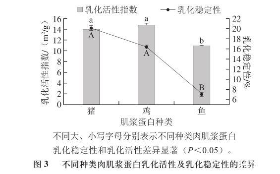 在前面的研究中得到,蛋白質(zhì)的疏水性及粒徑大小等會(huì)影響其油-水界面的性質(zhì),而蛋白質(zhì)作為乳化劑其界面特性在它們形成和穩(wěn)定乳液能力方面起著重要作用,進(jìn)而影響蛋白質(zhì)的乳化活性。油-水界面屬于高能界面,未加乳化劑形成的乳化體系會(huì)很快崩潰,蛋白質(zhì)是兩性物質(zhì),既有疏水基團(tuán)也有親水基團(tuán),這樣才使得蛋白質(zhì)具有獨(dú)特的乳化性能,且蛋白質(zhì)表面疏水性越大,蛋白質(zhì)所制得的乳液穩(wěn)定性也會(huì)增強(qiáng)。對(duì)于不同肉類同種蛋白,表面特性和構(gòu)象特性的差異會(huì)引起乳化活性和乳化穩(wěn)定性的不同,如圖3所示。雞肉肌漿蛋白乳化活性最高,豬肉肌漿蛋白乳化活性稍低于雞肉但無(wú)顯著差異性(P>0.05),但是魚肉肌漿蛋白乳化活性顯著低于豬肉和雞肉肌漿蛋白(P<0.05),這一結(jié)論與蛋白構(gòu)象穩(wěn)定性結(jié)果相符合。在鹽酸胍誘導(dǎo)蛋白變性時(shí),隨時(shí)間的增加使其形成剛性結(jié)構(gòu),這正是導(dǎo)致魚肉肌漿蛋白的峰值變化速率相比較豬肉和雞肉而言差異性顯著且其乳化活性較低的原因。雞肉肌漿蛋白的穩(wěn)定性相對(duì)于豬肉肌漿蛋白有所下降但差異性不顯著,可能是因?yàn)殡u肉肌漿蛋白粒徑相對(duì)最大,導(dǎo)致其形成乳液液滴變大,而一般來(lái)說(shuō)乳液液滴越小越穩(wěn)定,所以粒徑可能是導(dǎo)致雞肉肌漿蛋白穩(wěn)定性變差的原因。而3種肌漿蛋白中魚肉肌漿蛋白的乳化穩(wěn)定性顯著最差(P<0.05),這可能與魚肉肌漿蛋白的構(gòu)象穩(wěn)定性相對(duì)較差有關(guān)。