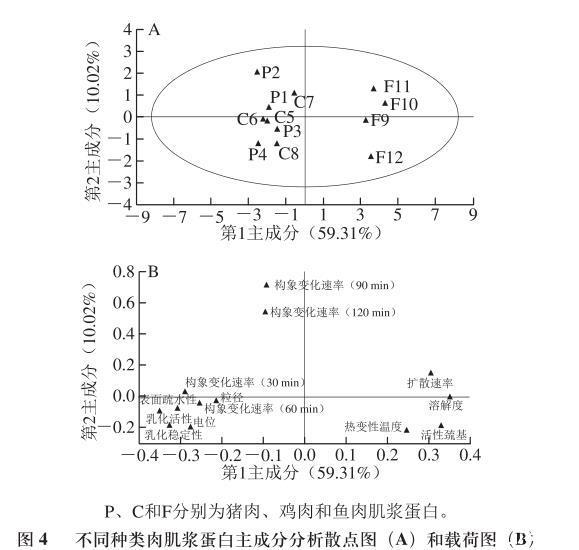 由于測(cè)量指標(biāo)間存在線性相關(guān)性,單一的指標(biāo)不能更清楚地反映出不同種類肉肌漿蛋白間的差異性,因此進(jìn)一步進(jìn)行主成分分析。由圖4A可知,第1主成分占59.31%,第2主成分占10.02%,總共占比69.33%,其中樣本F10、F11以及F12對(duì)第1主成分貢獻(xiàn)率較大,且與第1主成分呈正相關(guān),而C7樣本對(duì)第2主成分貢獻(xiàn)率較大且呈正相關(guān)。由圖4B可知,肌漿蛋白的擴(kuò)散速率、溶解度、乳化活性、乳化穩(wěn)定性、表面疏水性、電位、構(gòu)象在30 min及60 min時(shí)的變化速率對(duì)第1主成分貢獻(xiàn)率較大,其中擴(kuò)散速率和溶解度與第1主成分呈正相關(guān),而除此以外的其他指標(biāo)與第1主成分呈負(fù)相關(guān)。而蛋白的構(gòu)象在90 min以及120 min時(shí)的變化速率對(duì)第2主成分的貢獻(xiàn)率較大。圖中的乳化活性、表面疏水性、乳化穩(wěn)定性及電位間距離較近,說(shuō)明這些指標(biāo)間存在一定的相關(guān)性。綜合前述的研究結(jié)論可知肌漿蛋白的乳化活性和乳化穩(wěn)定性與其表面疏水性、電位和構(gòu)象變化速率有較強(qiáng)的相關(guān)性,而擴(kuò)散速率與溶解度間相關(guān)性較強(qiáng)。