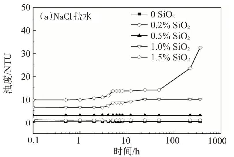 用模擬地層水配制的納米SiO2/SDS體系經(jīng)歷了澄清透明-渾濁-沉降的3個(gè)階段,靜置初始,納米SiO2質(zhì)量分?jǐn)?shù)為0.5%的體系的濁度不隨時(shí)間的延長而變化,表明此時(shí)體系穩(wěn)定;靜置1 h后,濁度明顯增加;靜置6 h后,體系的濁度又恢復(fù)到了初始值,由于實(shí)驗(yàn)測(cè)試的是樣品上半部分的濁度,說明此時(shí)體系已經(jīng)完全沉降。