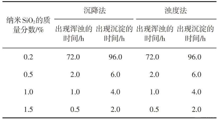 表1模擬地層水中納米SiO2/SDS體系出現(xiàn)渾濁、沉淀的時(shí)間(SDS質(zhì)量分?jǐn)?shù)為0.3%)