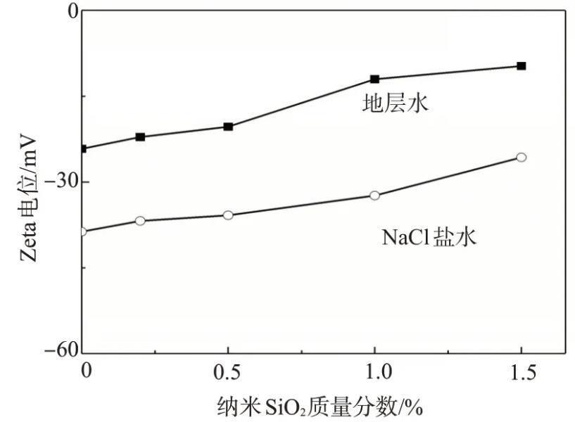 圖2給出了分別用模擬地層水和NaCl鹽水配制的不同納米SiO2含量的納米SiO2/SDS體系的Zeta電位。當(dāng)納米SiO2的質(zhì)量分?jǐn)?shù)分別為0.2%、0.5%和1.0%時(shí),用NaCl鹽水配制的納米SiO2/SDS體系的|ζ|均大于30 mV,因而表現(xiàn)出較好的穩(wěn)定性;而當(dāng)納米SiO2質(zhì)量分?jǐn)?shù)為1.5%時(shí),體系的|ζ|略低于30 mV,因此納米SiO2/SDS體系在靜置15 d后才出現(xiàn)輕微的混濁。用模擬地層水配制的納米SiO2/SDS體系的|ζ|均明顯小于30 mV,說明體系的穩(wěn)定性差,靜置幾小時(shí)即出現(xiàn)了渾濁和沉淀。納米SiO2帶負(fù)電,金屬陽離子Ca2+,Mg2+和Na+等的存在會(huì)壓縮納米SiO2的雙電層,由于Ca2+,Mg2+離子的價(jià)數(shù)高,壓縮雙電層的能力強(qiáng),導(dǎo)致體系的|ζ|降低,穩(wěn)定性變差,由此可見,要使納米SiO2/SDS分散體系具有良好的穩(wěn)定性,應(yīng)減少體系中二價(jià)Ca2+、Mg2+的含量。