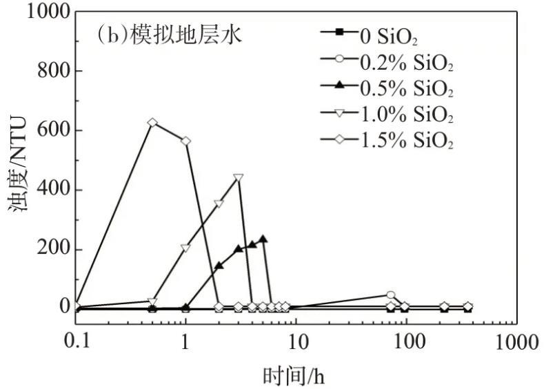 利用沉降法和濁度法分析分別用NaCl鹽水、模擬地層水配制的不同納米SiO2含量的納米SiO2/SDS體系的穩(wěn)定性,濁度法測(cè)試結(jié)果如圖1所示。用NaCl鹽水配制的SiO2/SDS體系在靜置15 d時(shí),僅納米SiO2質(zhì)量分?jǐn)?shù)為1.5%的體系出現(xiàn)了輕微的渾濁,而其它體系均保持澄清透明;當(dāng)納米SiO2質(zhì)量分?jǐn)?shù)為1.5%時(shí),SiO2/SDS體系的濁度隨靜置時(shí)間的延長稍有增大,其它體系的濁度幾乎不隨靜置時(shí)間的延長而變化,且均小于15 NTU。由此可見,用NaCl鹽水配制的納米SiO2/SDS體系的穩(wěn)定性良好。