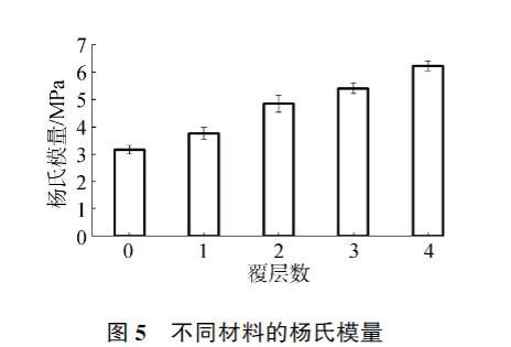 對(duì)羥基磷灰石和覆層材料的楊氏模量進(jìn)行了測(cè)量,結(jié)果如圖5所示??瞻椎牧u基磷灰石材料的楊氏模量為3.14±0.16 MPa,隨著覆層層數(shù)的增加楊氏模量逐漸增加,最高可達(dá)6.21±0.18 MPa,說明膠原蛋白肽的覆層能夠有效地改善羥基磷灰石材料的力學(xué)性能,提高其楊氏模量。