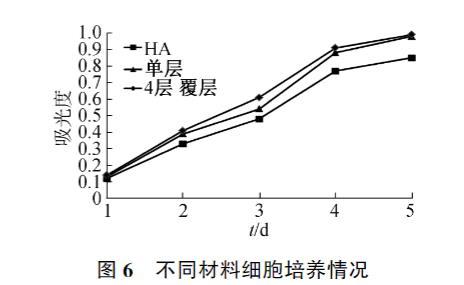 MC3T3-E1細(xì)胞在羥基磷灰石和覆層材料上培養(yǎng)5天的增殖情況見圖6。因結(jié)果類似,圖中僅列出了單層和4層覆層材料的增殖結(jié)果,可以看出在覆層材料上MC3T3-E1細(xì)胞增殖要優(yōu)于空白羥基磷灰石材料,表明所制覆層材料不僅無細(xì)胞毒性,而且因膠原蛋白肽的優(yōu)良生物相容性,能一定程度上促進(jìn)細(xì)胞增殖。所用的羥基磷灰石和膠原蛋白肽都是經(jīng)過實(shí)踐證明的生物相容性良好的材料,其對(duì)材料生物性能的提升作用是由其本身的生物相容性良好引起的,因此覆層層數(shù)對(duì)生物性能提升作用不明顯。