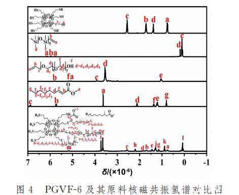 圖4為PGVF-6以及其原料的核磁共振對比圖。PGVF-6譜圖中,SH-POSS上的-SH質(zhì)子氫吸收峰已經(jīng)消失,接枝成功的APEG750單體,烯烴雙鍵的質(zhì)子氫吸收峰已經(jīng)消失,末端連接的-OH質(zhì)子氫吸收峰在5.21times 10^{-6}處;同樣反應(yīng)成功的2-壬烯酸甲酯單體,烯烴雙鍵的質(zhì)子氫吸收峰也同樣消失不見,連接O的末端烷烴-CH3質(zhì)子氫吸收峰處于3.72x10-6的位置,末端烷烴-CH3的質(zhì)子氫吸收峰在0.88x10-6處;最后成功反應(yīng)的VDMS單體,烯烴雙鍵的質(zhì)子氫吸收峰也已經(jīng)消失,后續(xù)Si上連接的所有甲基-CH3分別處在0.12x10-6和0.08x10-6處,可以得知PGVF-6雜化材料成功合成。