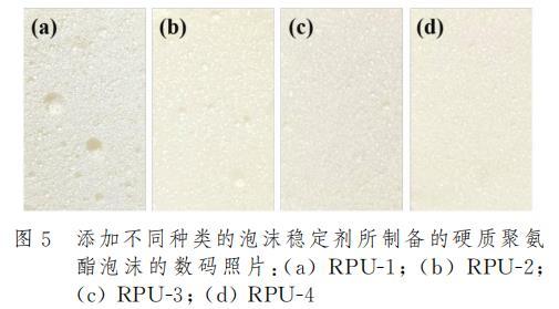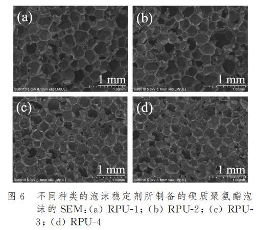泡沫穩(wěn)定劑的存在對于硬質(zhì)聚氨酯泡沫性能影響在宏觀上有著十分顯著的體現(xiàn)。圖5是添加不同種類的泡沫穩(wěn)定劑后制樣得到的硬質(zhì)聚氨酯泡沫橫截面的數(shù)碼照片。結(jié)果表明,接枝APEG鏈段的PAVE-5和PGVF-6泡沫穩(wěn)定劑所制備的聚氨酯泡沫RPU-3和RPU-4,其泡孔結(jié)構(gòu)相較于市售產(chǎn)品所制備的聚氨酯泡沫展現(xiàn)出了更加細(xì)膩均勻的泡孔結(jié)構(gòu),而市售產(chǎn)品所形成的泡沫則表現(xiàn)出較為粗糙且孔徑不均勻的泡孔結(jié)構(gòu)。這表明親水結(jié)構(gòu)有利于泡沫穩(wěn)定劑均勻分散在多元醇中并使得反應(yīng)充分進(jìn)行,泡孔尺寸細(xì)小致密,有利于改善硬質(zhì)聚氨酯泡沫的壓縮性能。