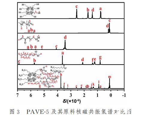 采用核磁共振氫譜對所制備復(fù)合材料的化學(xué)結(jié)構(gòu)進(jìn)一步表征分析。圖3為PAVE-5以及其原料的核磁共振對比圖。PAVE-5譜圖中,SH-POSS的-SH質(zhì)子氫吸收峰已經(jīng)消失,接枝成功的APEG400烯烴雙鍵的質(zhì)子氫吸收峰已經(jīng)明顯消失,末端連接的-OH質(zhì)子氫吸收峰在5.32x10-6處;同樣反應(yīng)成功的2-壬烯酸甲酯單體,烯烴雙鍵的質(zhì)子氫吸收峰也同樣消失不見,連接O的末端烷烴-CH3質(zhì)子氫吸收峰處于3.75x 10-6的位置;最后成功反應(yīng)的VDMS單體,烯烴雙鍵的質(zhì)子氫吸收峰也已經(jīng)消失,Si上連接的所有甲基CH3分別處在0.09x10-6和0.14x10-6處,可以得知PAVE-5成功合成。
