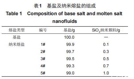 本實(shí)驗(yàn)所用材料為NaNO3、KNO3和30nm的SiO2納米顆粒。所有實(shí)驗(yàn)材料在制備納米熔鹽之前均需要經(jīng)過(guò)干燥處理。使用型號(hào)為Mettler Toledo ME104,精度為0.1mg的電子天平對(duì)干燥后的熔融鹽和納米顆粒進(jìn)行稱量。見(jiàn)表1,按照比例將基鹽及納米顆粒進(jìn)行稱量后,利用高溫熔融法將SiO2納米顆粒均勻分散至基鹽中,將制備好的納米熔鹽樣品放入干燥箱中保存?zhèn)溆谩?