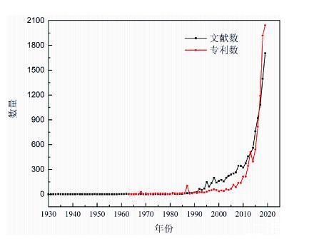 圖2氣凝膠論文與專(zhuān)利發(fā)表數(shù)量與年度趨勢(shì)圖,數(shù)據(jù)統(tǒng)計(jì)于web of science