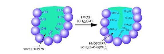 如圖6所示,采用三甲基氯硅烷(trimethyl chlorosilane,簡(jiǎn)稱TMCS)對(duì)氧化硅凝膠孔壁表面進(jìn)行疏水化處理,可實(shí)現(xiàn)常壓干燥制備氣凝膠。其中TMCS和異丙醇(isopropanol,簡(jiǎn)稱IPA)分別作為疏水化試劑和溶劑。TMCS與靠近顆粒表面的孔反應(yīng),使孔壁表面的Si-OH轉(zhuǎn)化成硅甲基,有利于阻止水的吸附,形成孔表面疏水區(qū)域。同時(shí),TMCS水解縮合生成六甲基二硅氧烷(hexamethyldisiloxane,簡(jiǎn)稱HMDSO),且不與水混溶,隨著反應(yīng)的持續(xù)進(jìn)行,水相逐漸從孔中排出,最終形成超疏水氣凝膠。