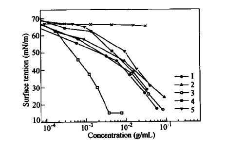 聚丙烯酸(PAA)是研究較多的合成聚電解質,其分子鏈在水溶液中離解而帶有大量羧酸陰離子,Ishimuro等較詳細研究了PAA水溶液的表面張力隨其離解度(PH值)及離子強度(NaCl濃度)的變化。根據(jù)含氟烴聚乙二醇的研究可知,全氟烴具有極強的憎水特性,當它作為長鏈分子的一個端基于水溶液中時,鏈端趨向于向空氣-水界面的吸附,而長鏈則由于與溶劑水的相互作用而在水中形成尾形鏈構象。尤其在高表面濃度時,形成十分特殊的刷狀高分子。從分子設計來看,若能合成出全氟烴端基聚丙烯酸,由于其端基的特殊結構,它將表現(xiàn)出完全不同于普通聚丙烯酸的界面吸附行為。