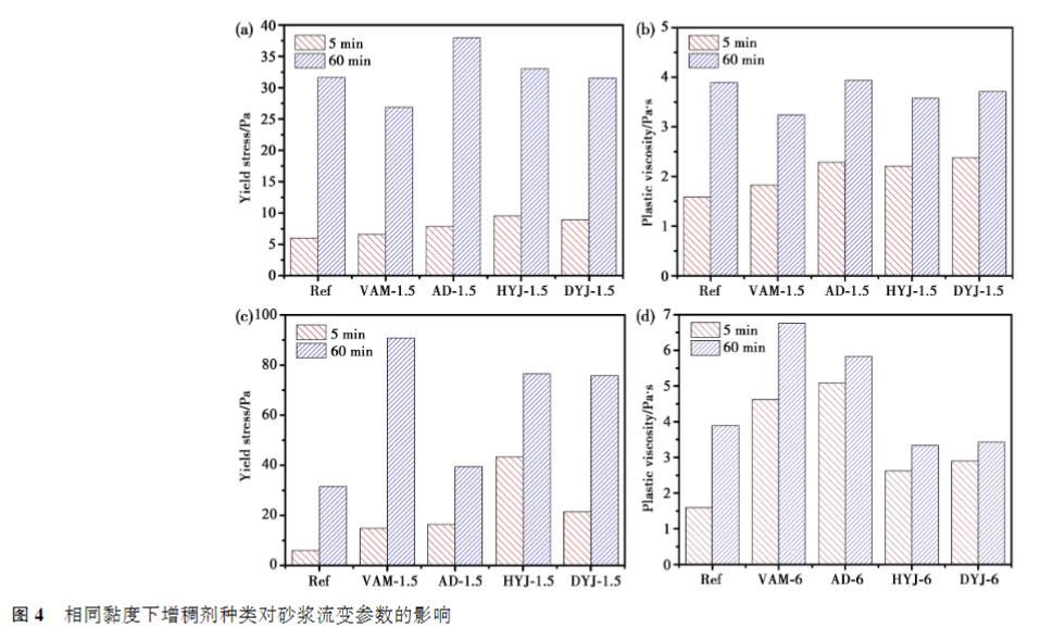 采用改進的Bingham模型對砂漿的流變曲線進行擬合,獲取屈服應力和塑性黏度。當溶液黏度為1.5mPa·s時,砂漿的初始屈服應力和塑性黏度相對于基準砂漿略微增大,60min后的流變參數(shù)出現(xiàn)不同發(fā)展趨勢;當溶液黏度為6mPa·s時,砂漿的屈服應力均高于基準砂漿;VAM和AD砂漿的初始屈服應力高于基準砂漿147%和172%,塑性黏度高出基準砂漿的191%和220%;HYJ和DYJ砂漿的初始屈服應力高于基準砂漿619%和254%,初始塑性黏度高出基準砂漿的64%和82%.