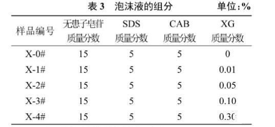 表3為泡沫溶液的配方。根據三元復配體系的發(fā)泡性能,選取發(fā)泡性能最佳的9號組,無患子皂苷、SDS、CAB質量分數固定在15%、5%、5%。研究XG濃度變化對泡沫溶液性能的影響。
