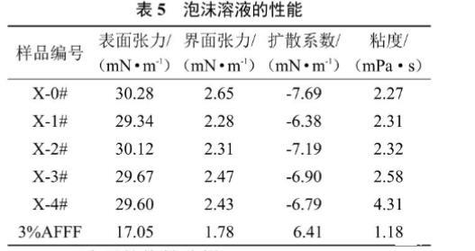 測得環(huán)己烷的表面張力為25.24 mN/m,根據式(1),6組試驗組其擴散系數如表5所示。X-0#、X-1#、X-2#、X-3#和X-4#樣品擴散系數都為負值。試劑復配后活性劑分子疏水基水分子之間依然有較大斥力,因此,此配方所產生的泡沫無法在油面上形成水膜[11]。X-0#、X-1#、X-2#、X-3#和X-4#樣品之間的表面張力和界面張力表現出較小的差異,分別在29.60~30.28 mN/m和2.31~2.65 mN/m之間。表明XG對泡沫溶液的表面張力和界面張力影響較小,影響表面張力和界面張力的主要原因是表面活性劑的種類。X-4#樣品的粘度變化比較明顯,因為XG濃度的增加導致聚合物網絡結構的增強,并且XG與表面活性劑相互作用:通過靜電、疏水和氫鍵等發(fā)生,這有助于顯著增加溶液粘度的協(xié)同效應。