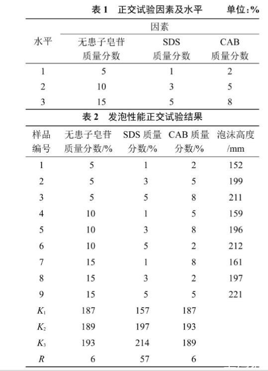 根據正交表測定其發(fā)泡高度,結果見表2。表2中K1、K2、K3表示各因素在相應水平下評價指標的平均值,R為各因素相應水平下評價指標的級差。發(fā)泡高度的極差R值表明,各因素的重要性依次為SDS>CAB=無患子皂苷,SDS對復配體系的發(fā)泡性能影響最大。由表2中發(fā)泡高度的K值可見,發(fā)泡性能最佳的組合是第9組。表面活性劑復配后隨著其添加量的增加,空氣與液膜之間的活性劑分子濃度增加,有利于提高泡沫溶液的發(fā)泡能力[9]。
