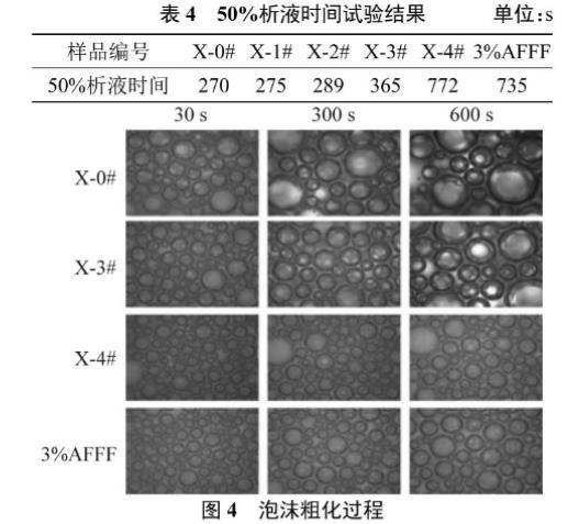 泡沫的穩(wěn)定性主要由泡沫的排水、粗化和聚并等多因素決定[10]。雙注射器技術產生的6種泡沫的圖像見圖3,而6種泡沫的50%析液時間測定結果見表4。這6種泡沫在0 s時有相同的初始體積,在重力作用下發(fā)生泡沫排水現象,600 s后6種泡沫的排水體積之間存在很大的差異,X-0#、X-1#和X-2#樣品泡沫排水量幾乎達到發(fā)泡前泡沫溶液的初始體積,X-3#泡沫排水量明顯降低,X-4#泡沫的排水體積較3%AFFF的排水體積少。以上結果表明添加質量分數0.30%的XG能很好地減緩泡沫排水,使無氟泡沫和商用泡沫滅火劑有相當的泡沫穩(wěn)定性。