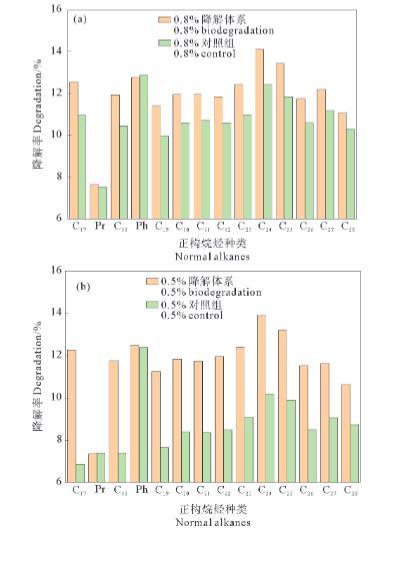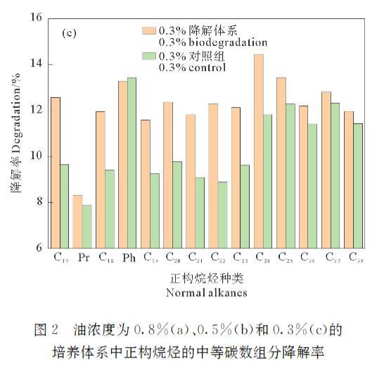 圖2油濃度為0.8%(a)、0.5%(b)和0.3%(c)的培養(yǎng)體系中正構烷烴的中等碳數(shù)組分降解率