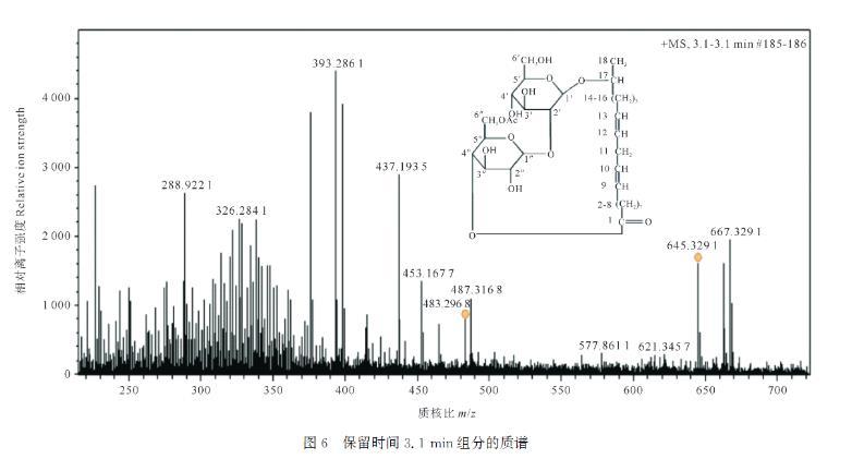 保留時(shí)間為3.1 min時(shí)色譜峰豐度最高。對該物質(zhì)進(jìn)行詳細(xì)分析,質(zhì)荷比(m/z)645.32的碎片為單乙?;〈膬?nèi)酯型槐糖脂的分子離子峰,m/z 667.32為[M+Na]+峰,m/z 483.29為[M+H-C8H12O6]+峰,其中C8H12O6為乙?;〈黔h(huán)。上述分析表明此物質(zhì)為內(nèi)酯型槐糖脂,具體名稱為:17-L-[(2'-O-β-D-吡喃葡萄糖基-β-D-吡喃葡萄糖基)-O-]十八二烯酸-1',4″-內(nèi)酯-6″乙酸酯。